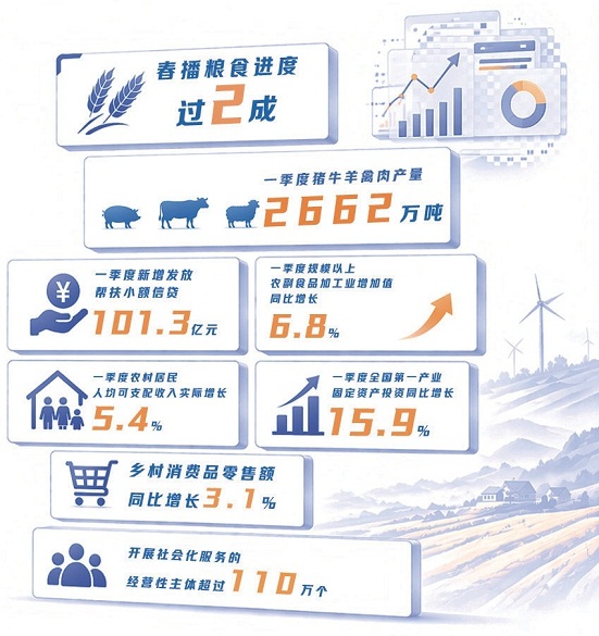 2026年是“十五五”开局之年,做好“三农”工作至关重要。麦尔丹·木盖提介绍,今年以来,农业农村经济保持良好发展势头。粮油生产基础较好,冬小麦长势和生育进程基本赶上常年。冬油菜面积稳定,长势较好,春播粮食进度过两成,同比持平略快;“菜篮子”产品供应充足,肉、奶、水产品产量分别增长4.8%、3.4%和4.3%,生猪产能逐步优化,价格企稳;常态化精准帮扶开局良好,新增发放帮扶小额信贷101.3亿元,帮扶对象务工稳定;宜居宜业和美乡村建设扎实推进,一季度农村居民人均可支配收入实际增长5.4%;农业投资和农村消费稳步增长,全国第一产业固定资产投资同比增长15.9%,乡村消费品零售额增长3.1%;农村改革持续深化,土地延包整省试点全面开展,联农带农机制不断健全,社会化服务覆盖近9300万户小农户。