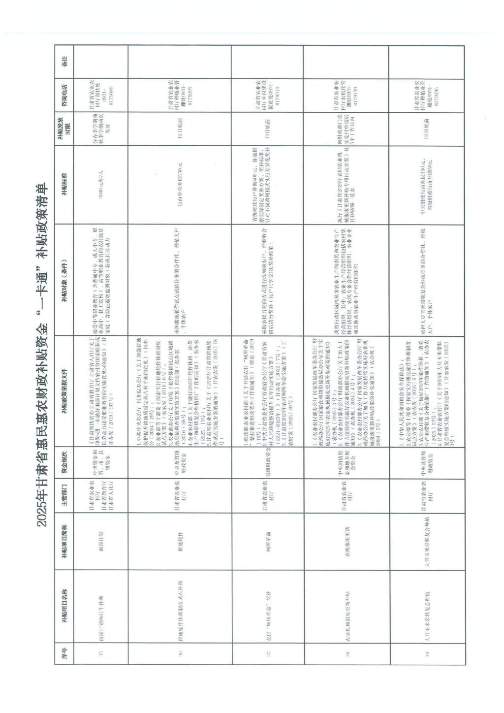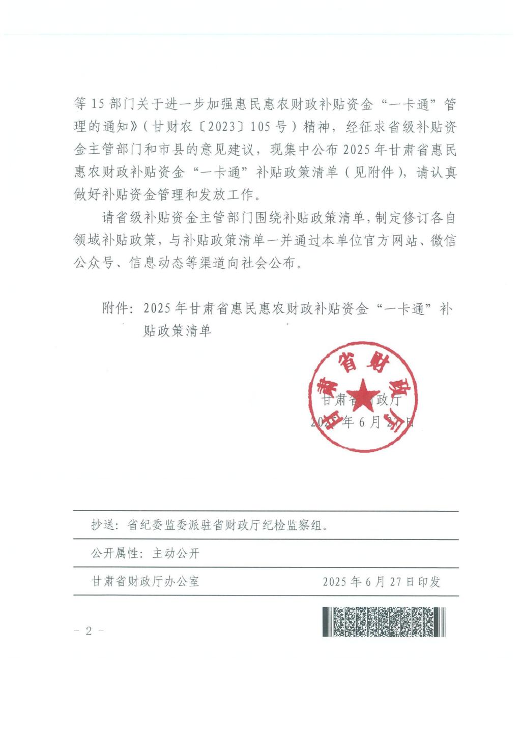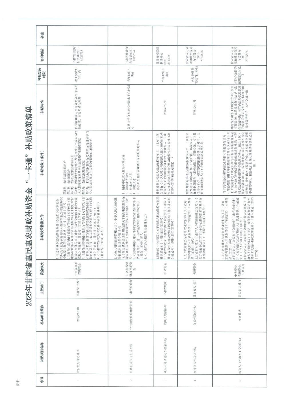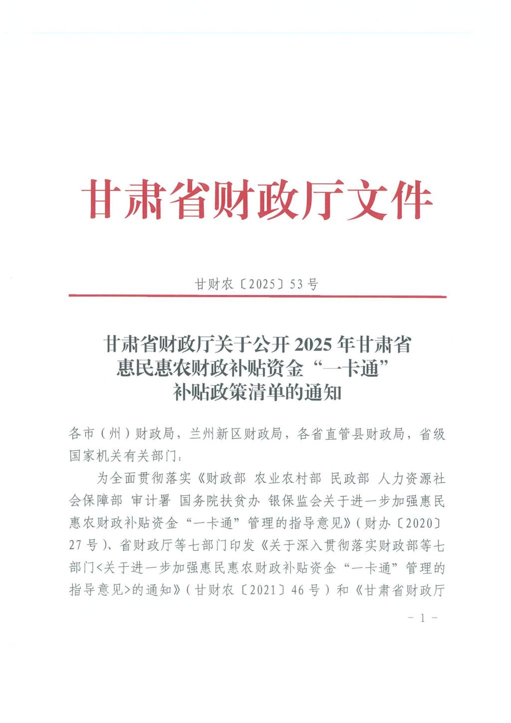 甘肃省财政厅关于公开2025年甘肃省惠民惠农财政补贴资金“一卡通”补贴政策清单的通知(甘财农【2025】53号)